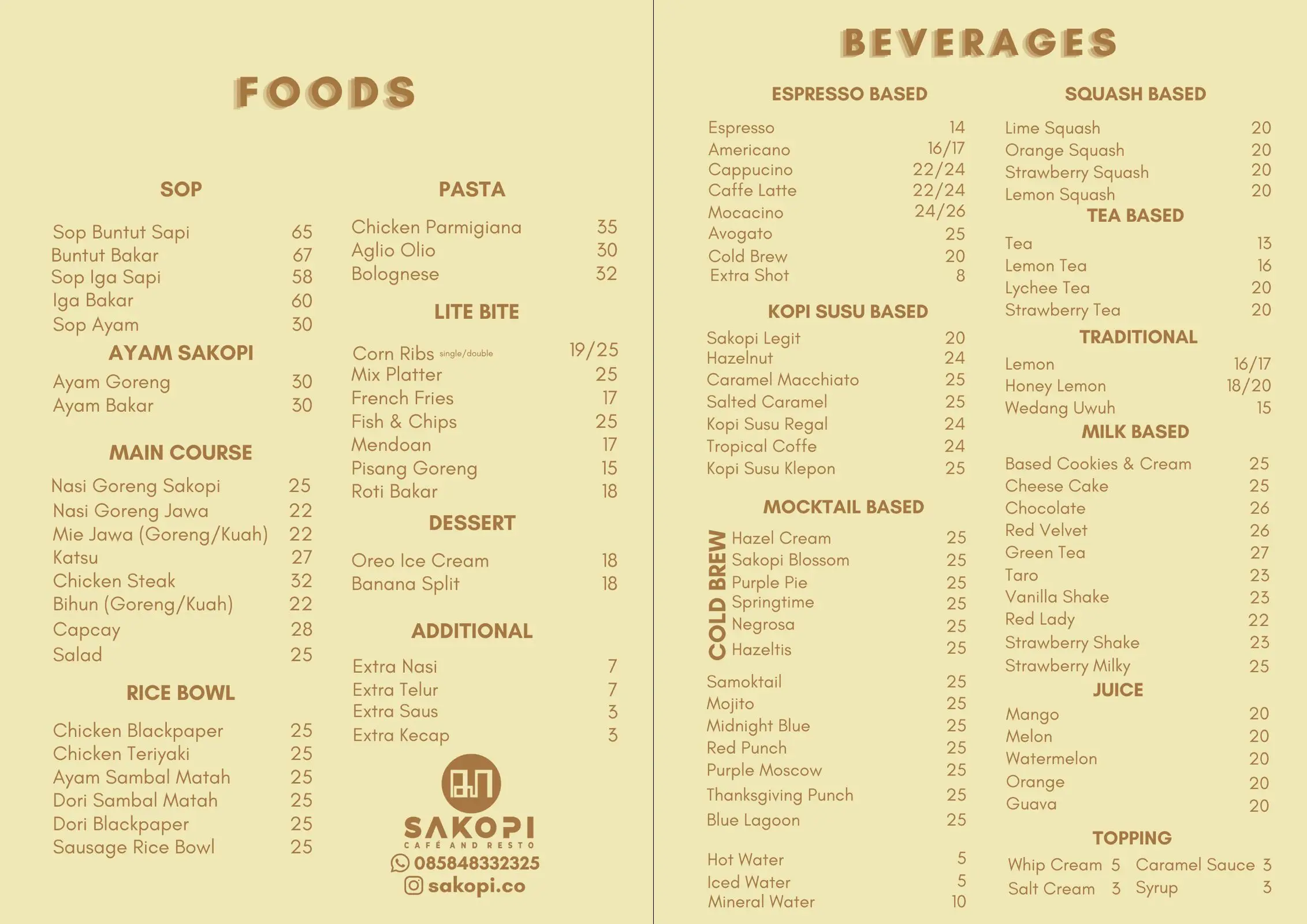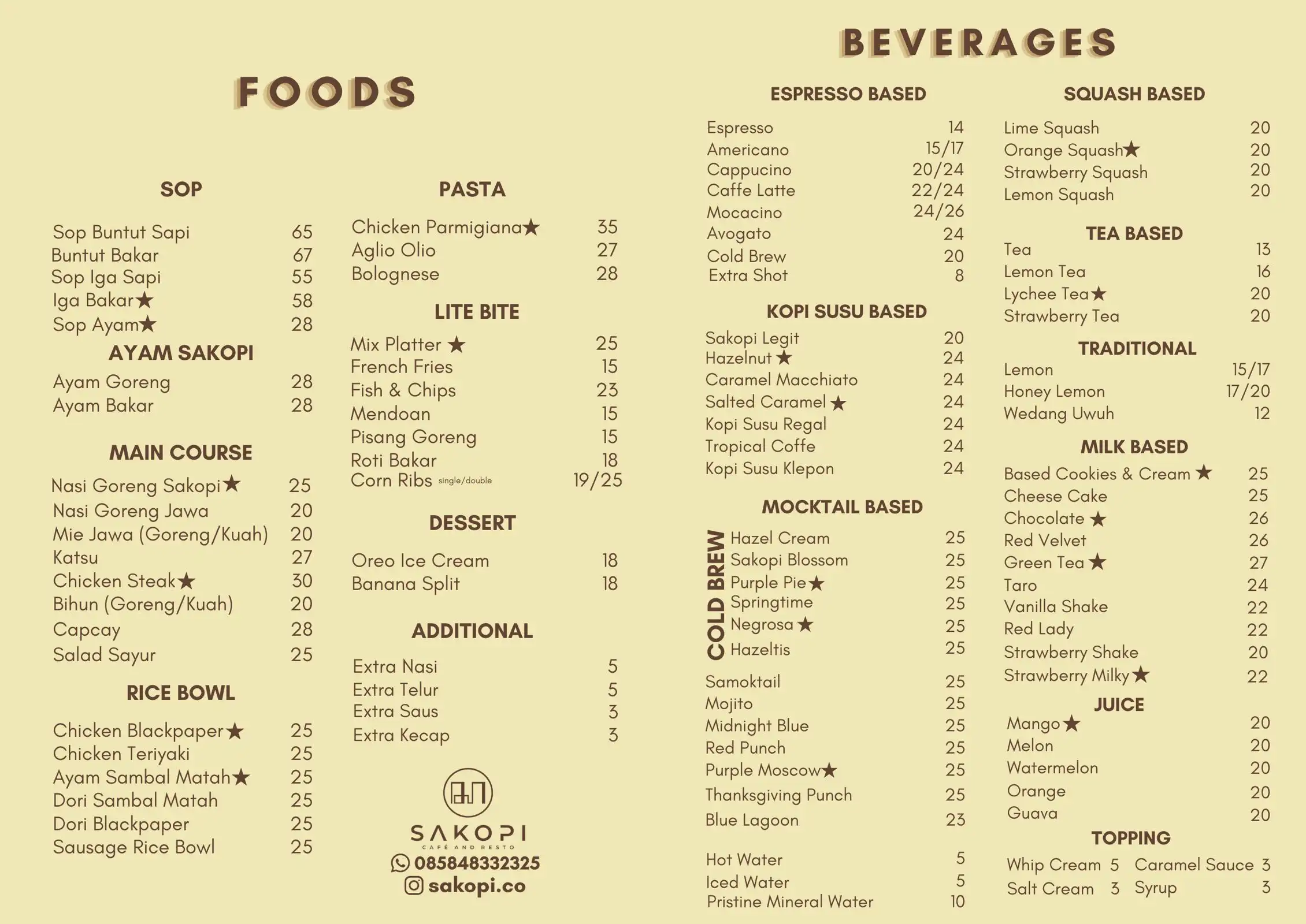 Sakopi adalah salah satu cafe dan resto terbaik di kota Magelang. Berdiri sejak tahun 2022, nama Sakopi sudah sangat populer dan tidak asing di telinga warga Magelang. Sakopi menyajikan makanan dan minuman yang lezat. Tak hanya itu Sakopi juga menjadi tempat nobar Timnas Indonesia yang resmi di Magelang. Suka nongkrong sambil dengerin musik? Sakopi menyediakan live music dengan kualitas terbaik tiap hari Rabu- Minggu pukul 19.30 -23.00